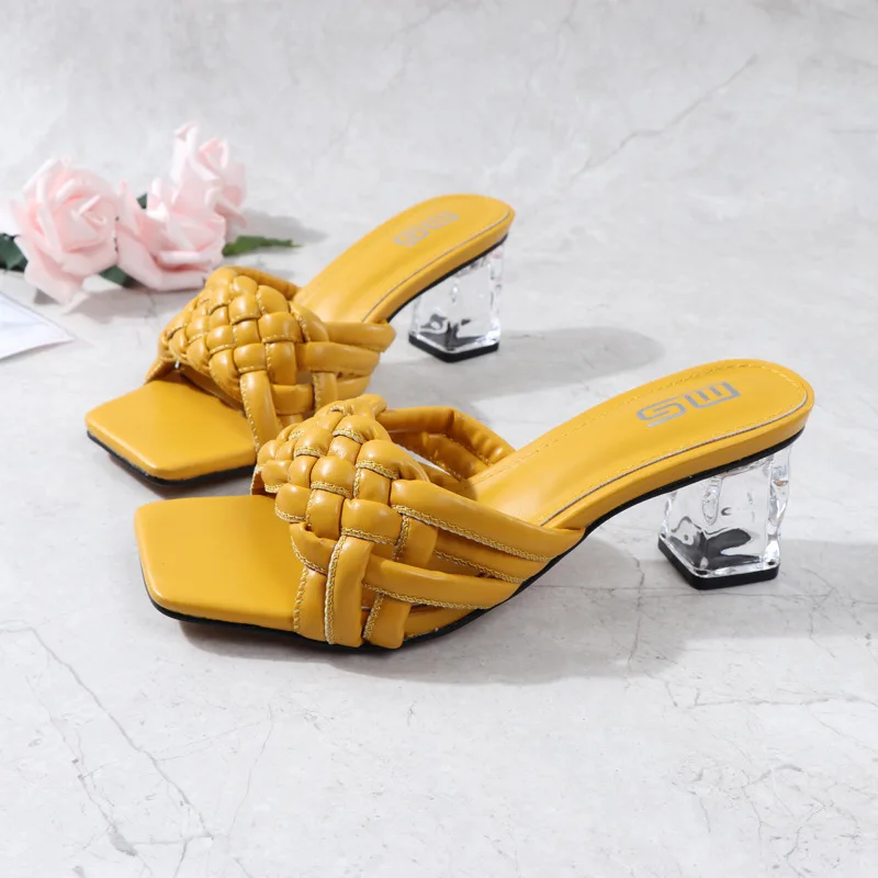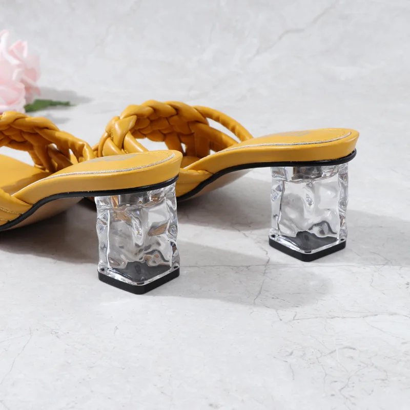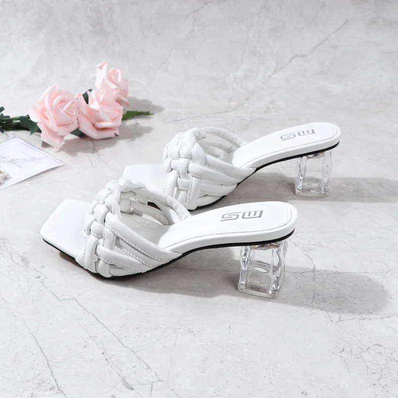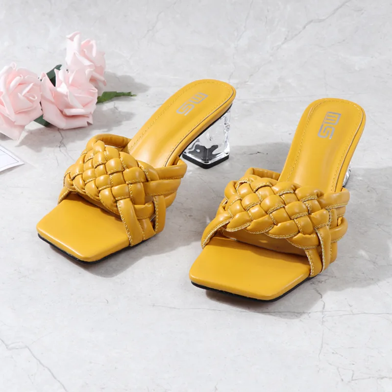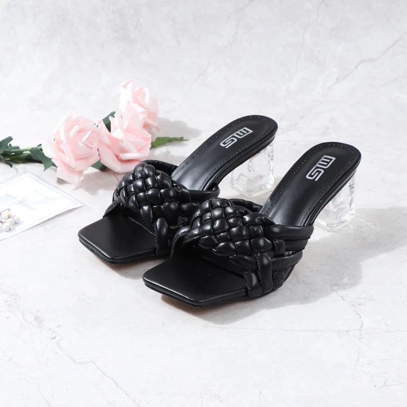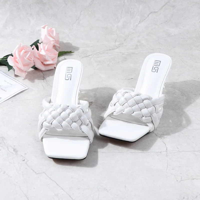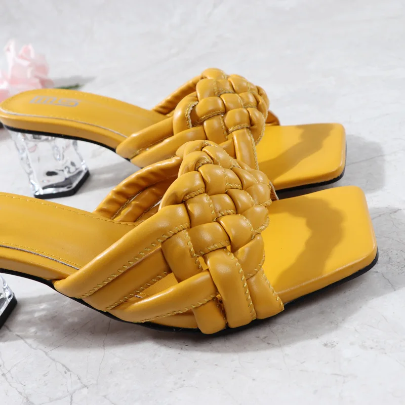 Hot Women Shoes 2021 New Fashion Chunky Higt Heel Slippers European American Braided Square Open Toe Slipper Large For Women