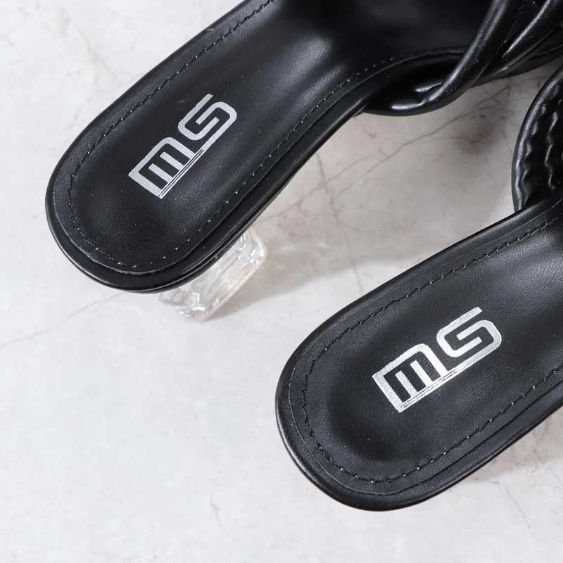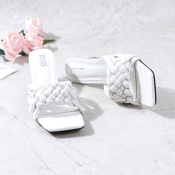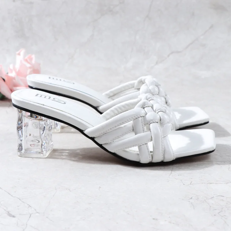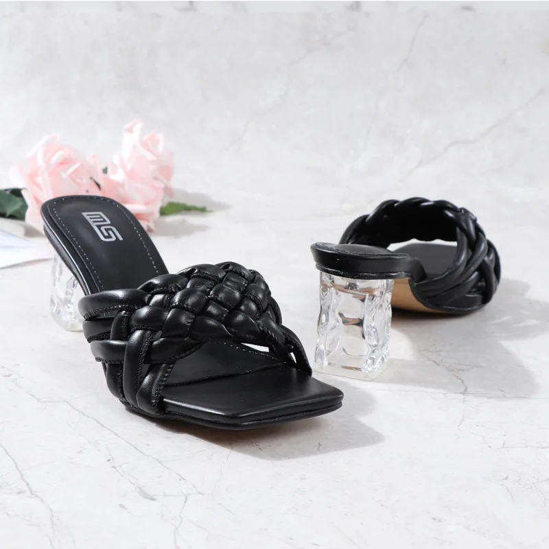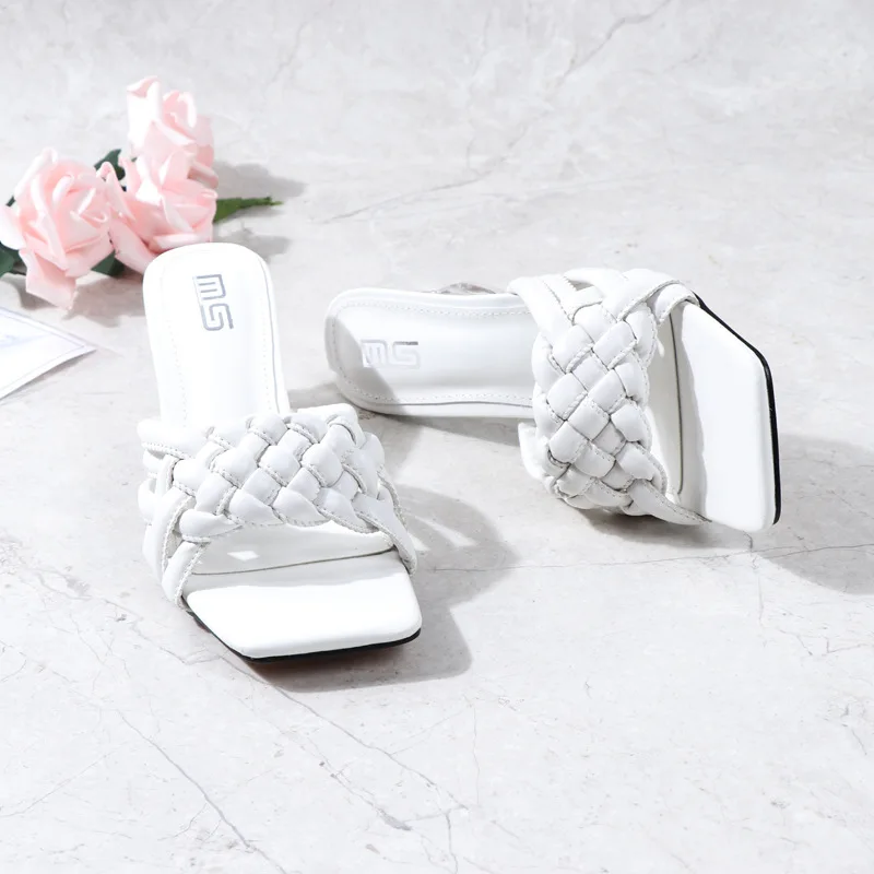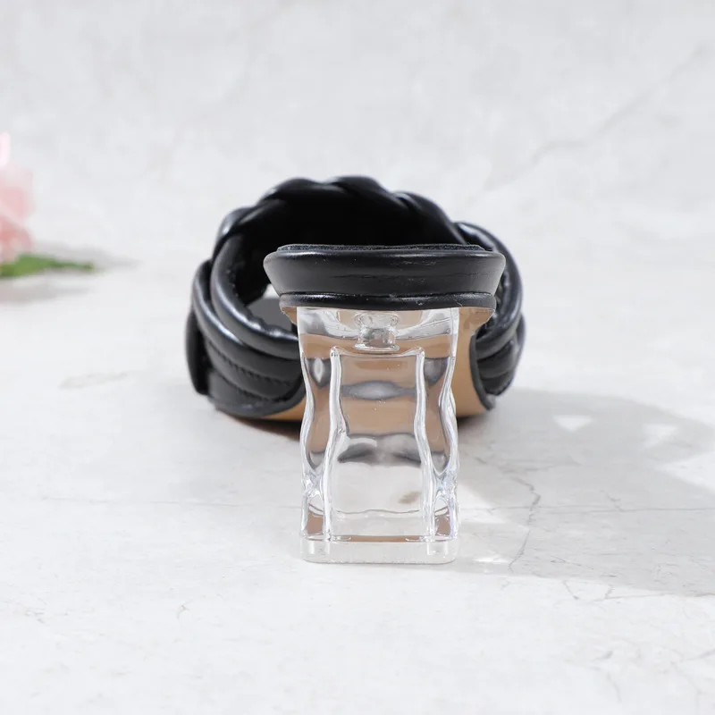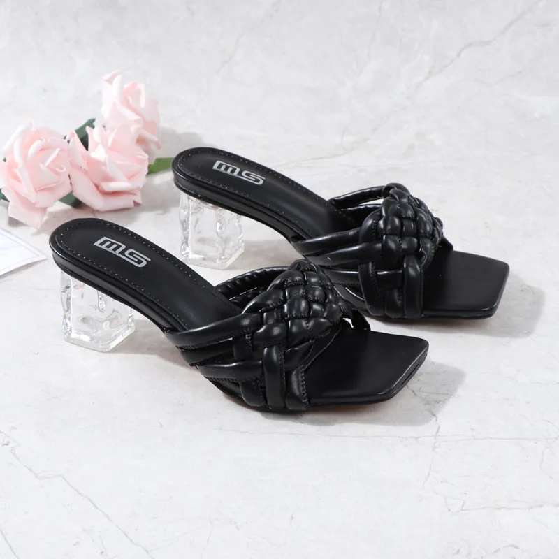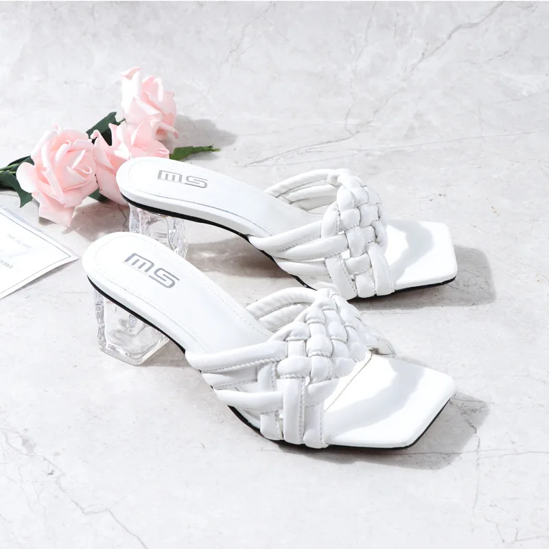 Hot Women Shoes 2021 New Fashion Chunky Higt Heel Slippers European American Braided Square Open Toe Slipper Large For Women