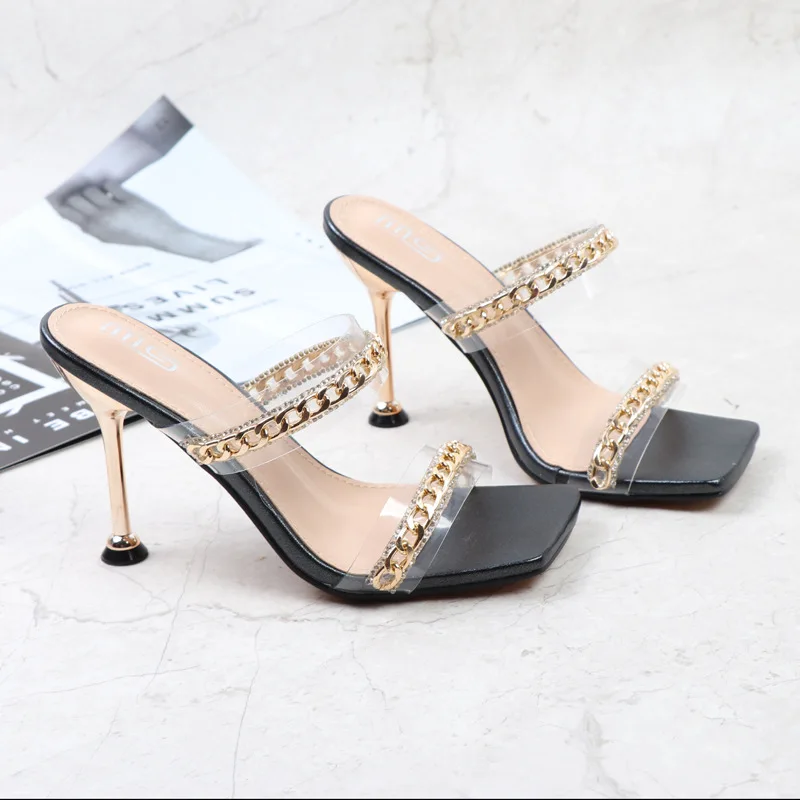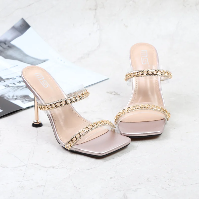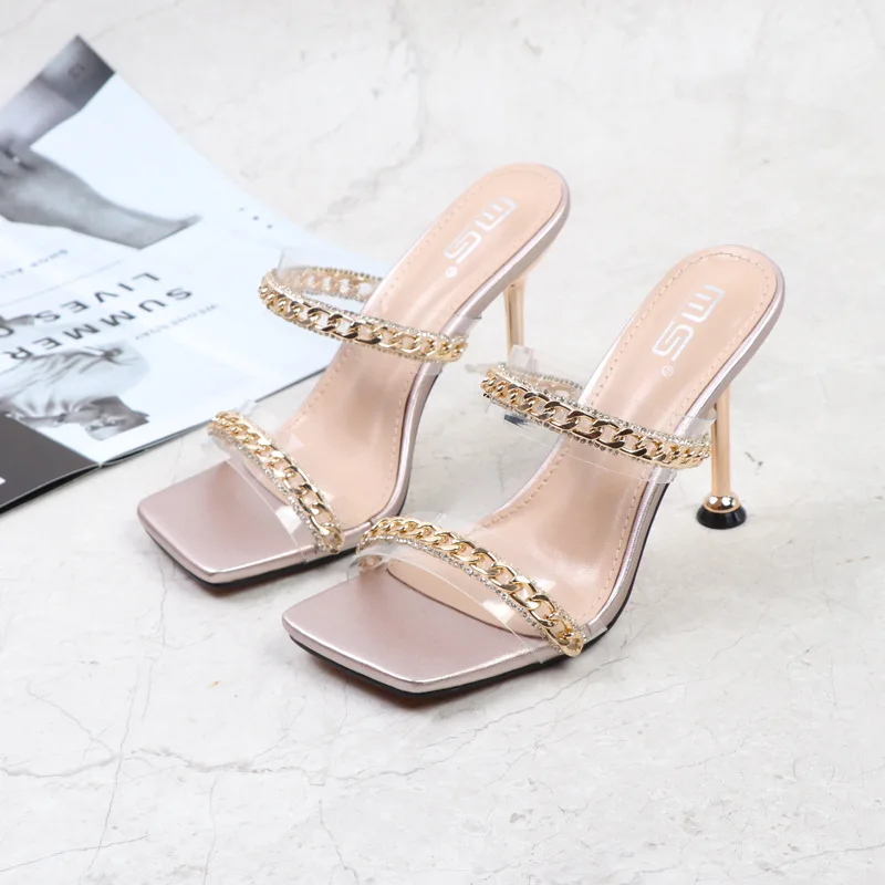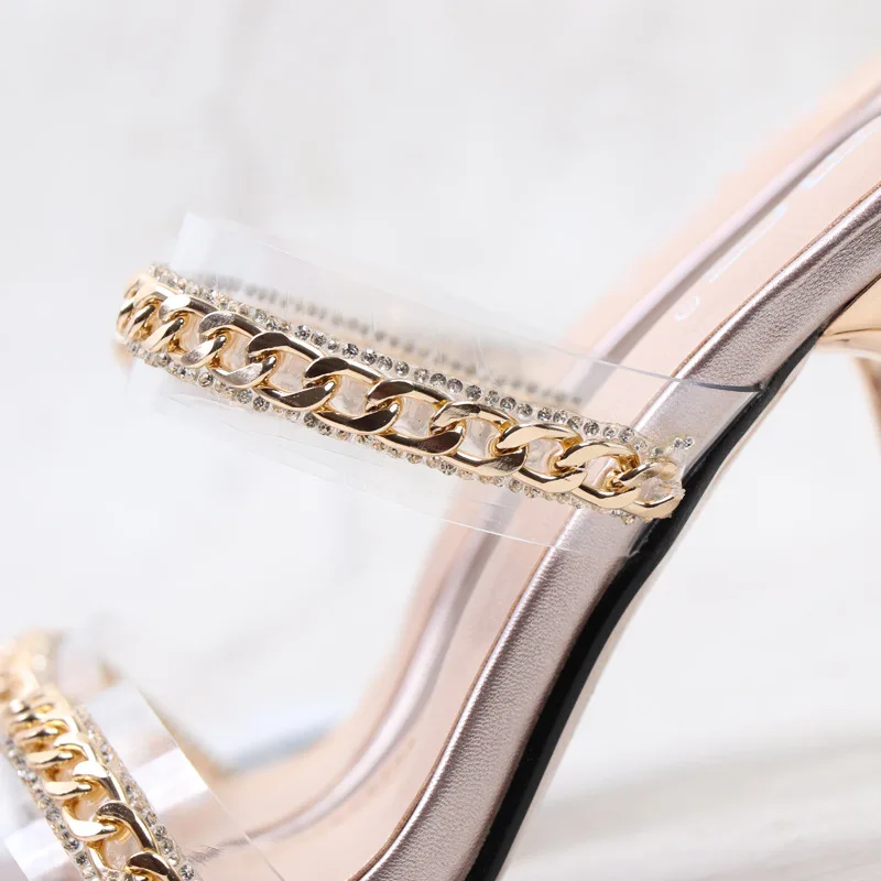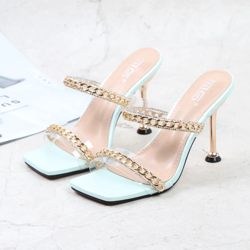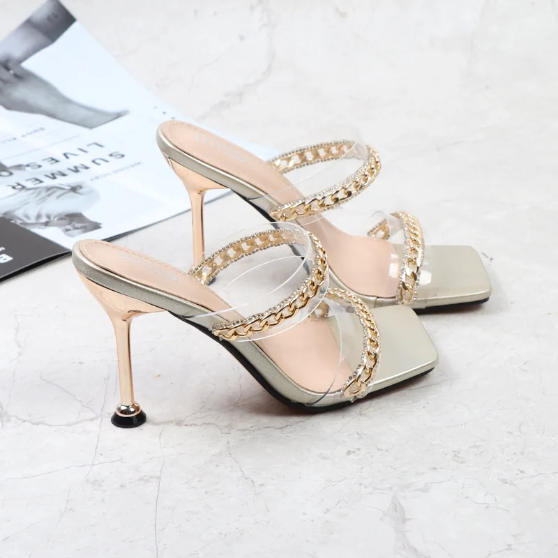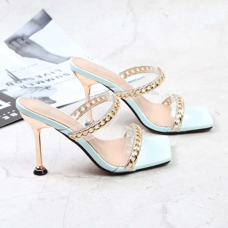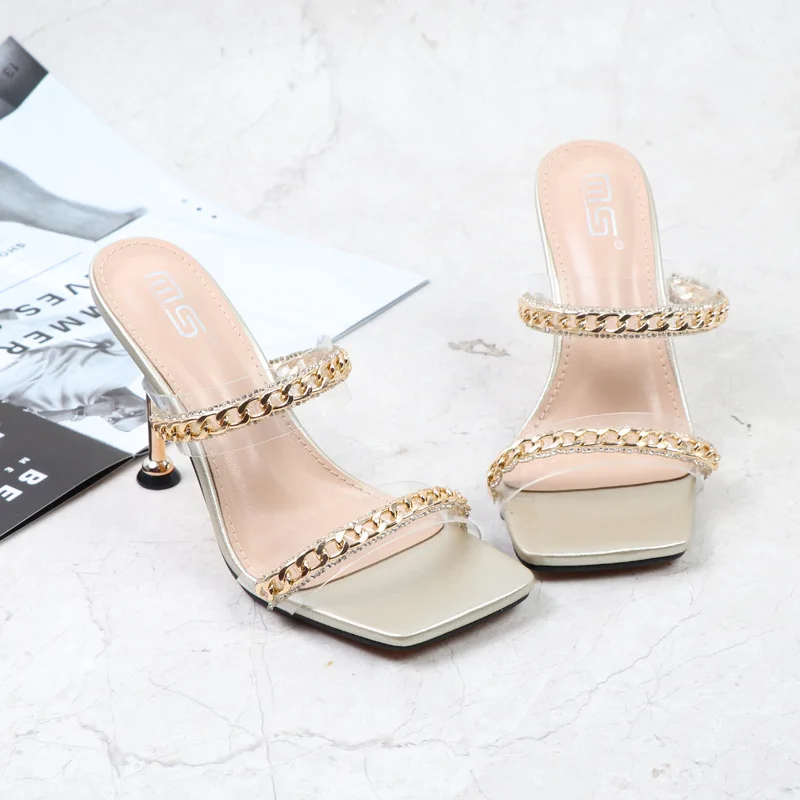Shoes for Women Summer 2021 Open Toe High Heel Europe and United States Sexy One Word Rhinestone Sandals Big Size Outside Wear