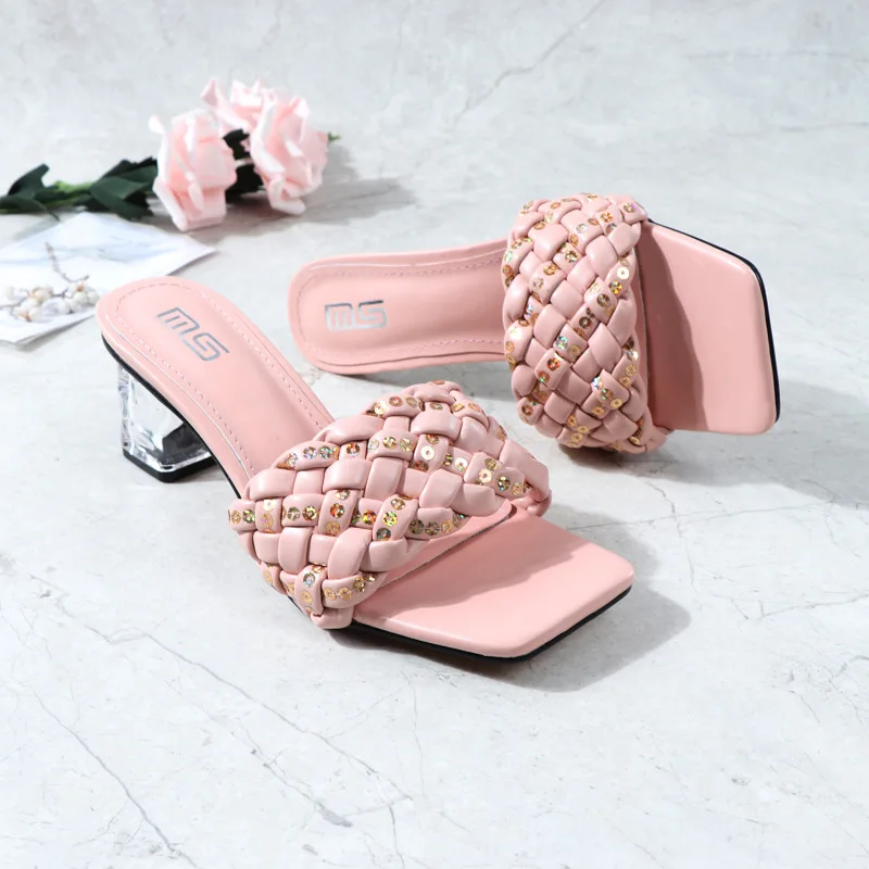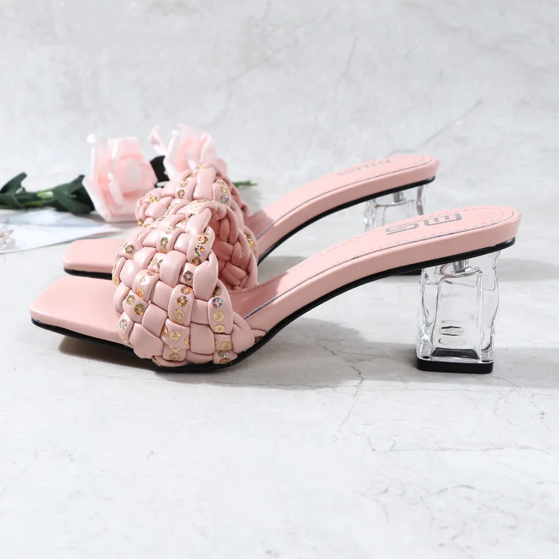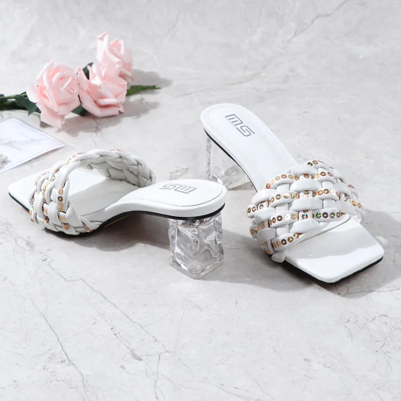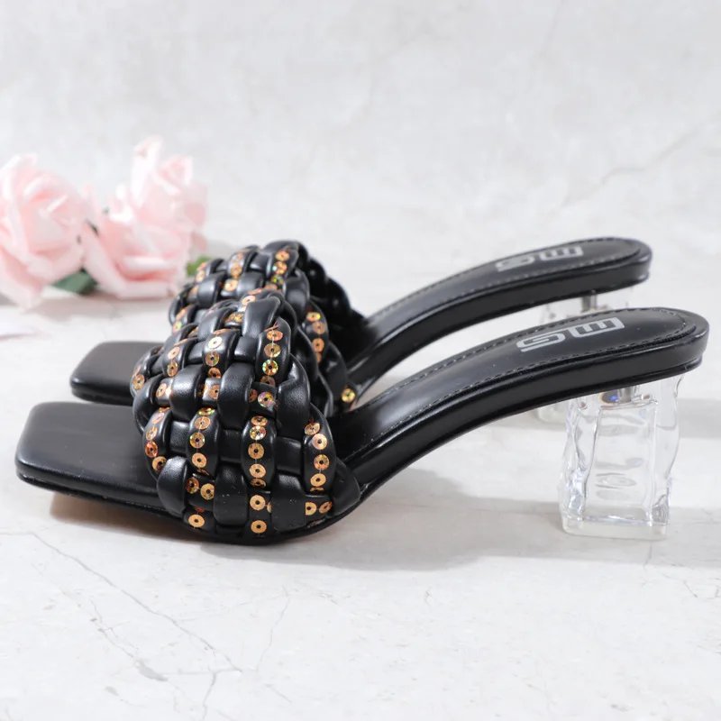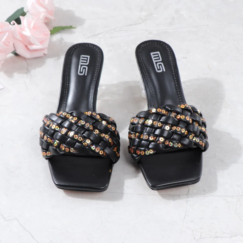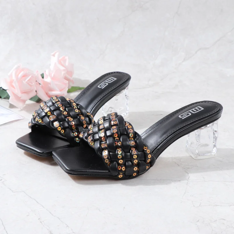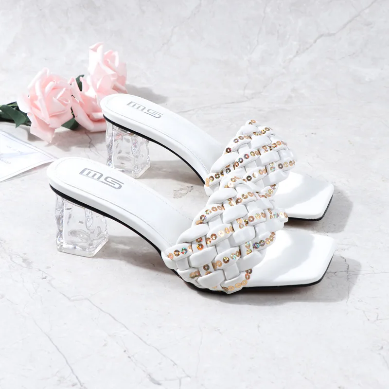 Women Shoes 6CM High Heel 2021 Summer Large Size Thick Sequined Slippers Sexy Outside Wearing One Word Comfortable Feet Sandals