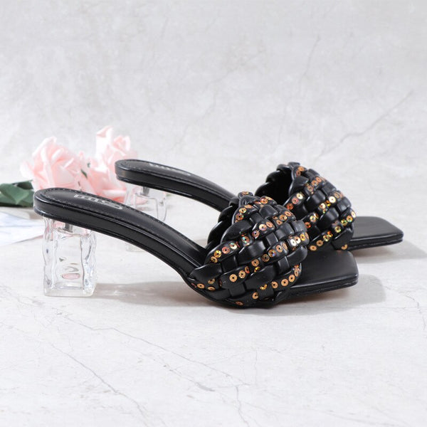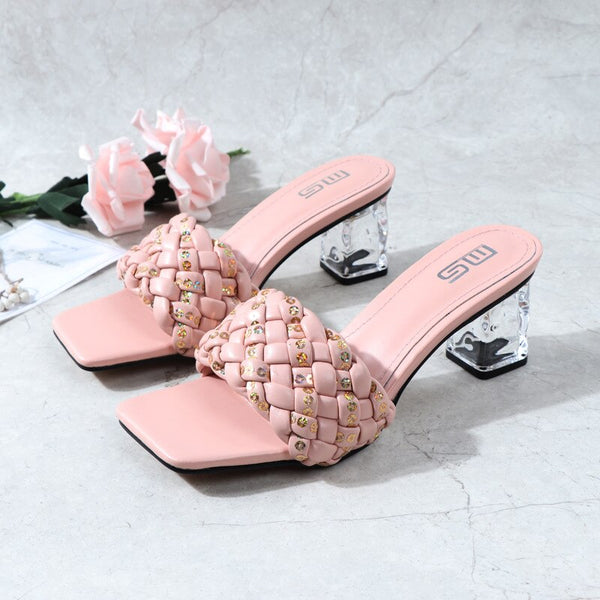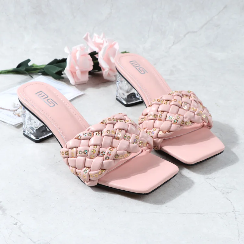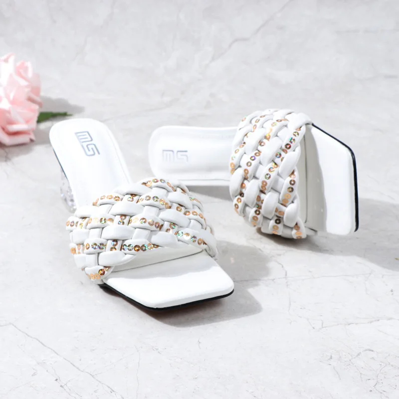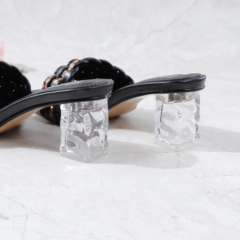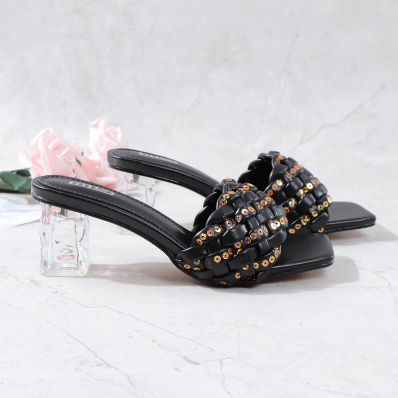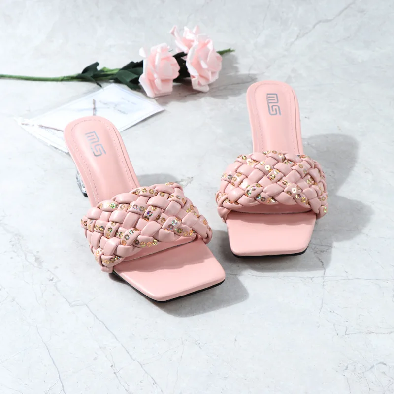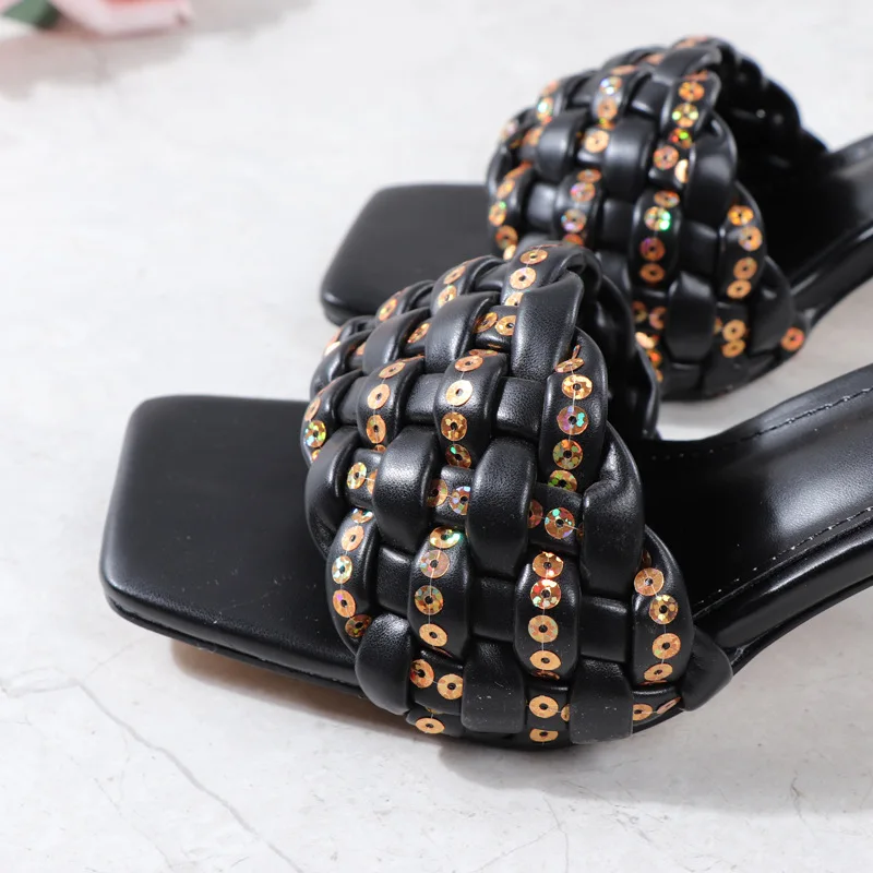 Women Shoes 6CM High Heel 2021 Summer Large Size Thick Sequined Slippers Sexy Outside Wearing One Word Comfortable Feet Sandals