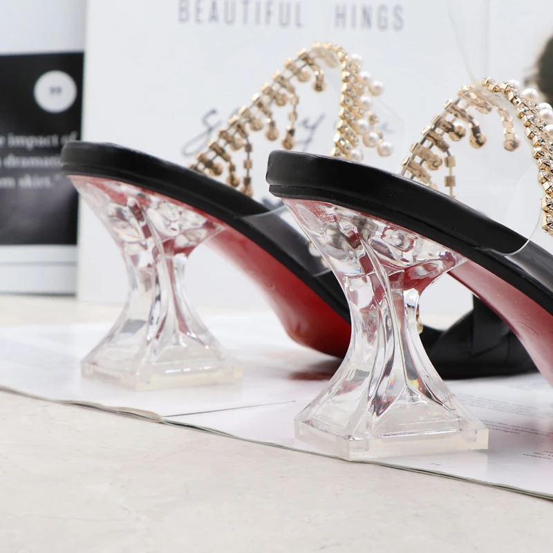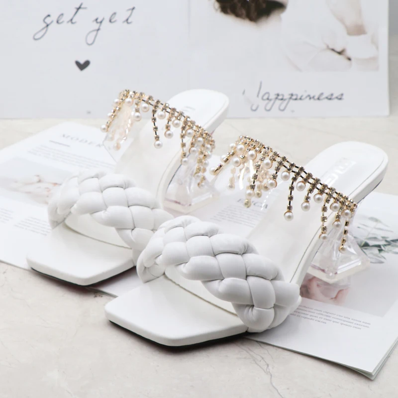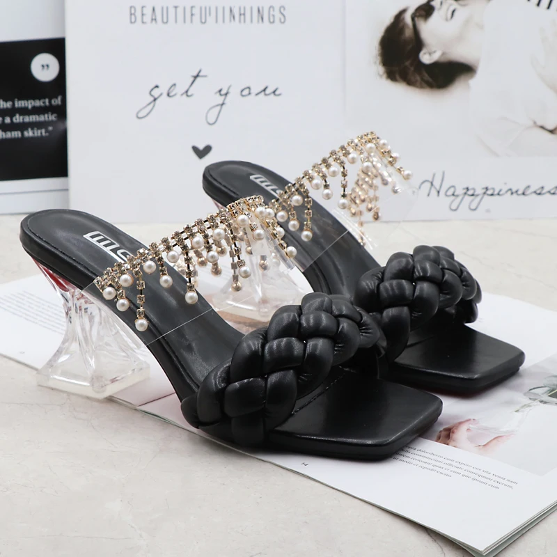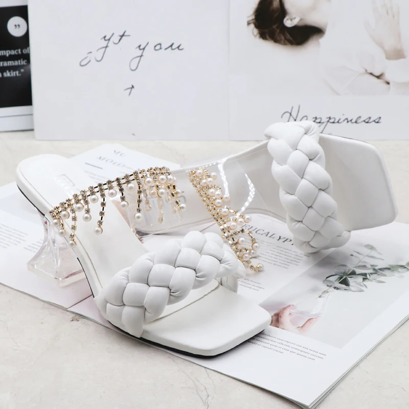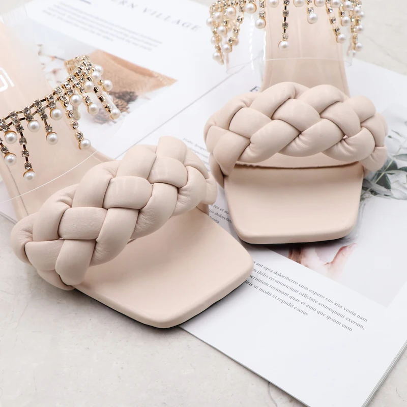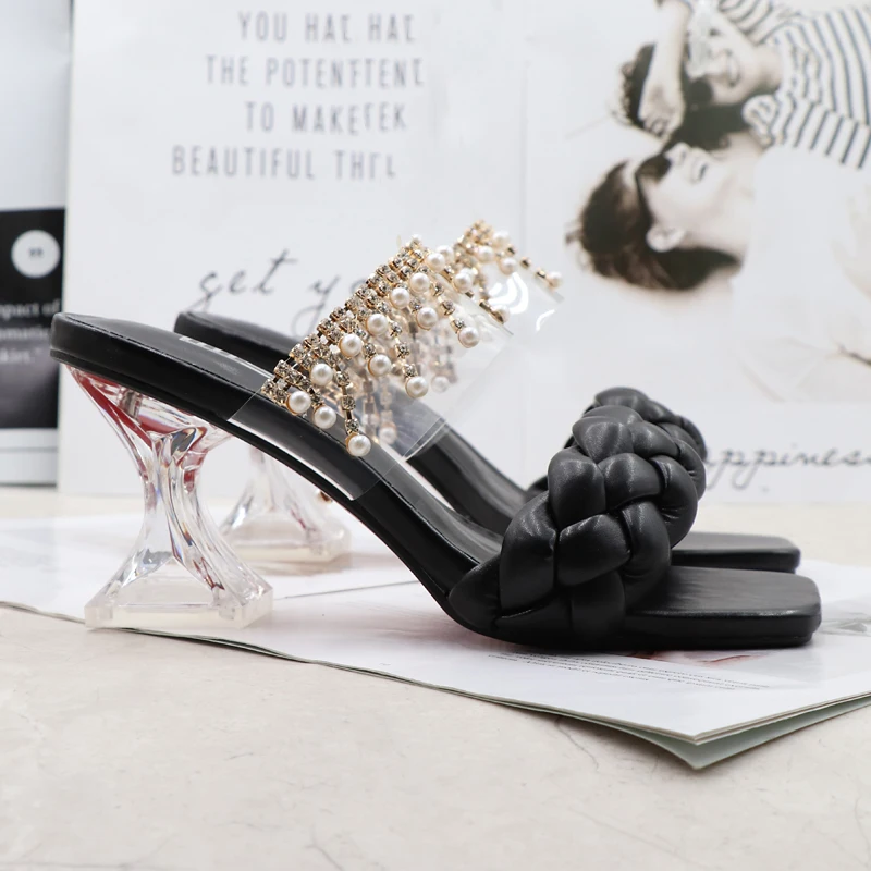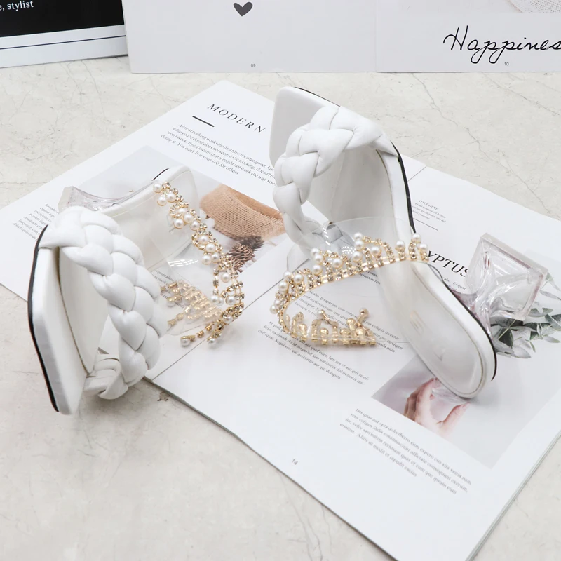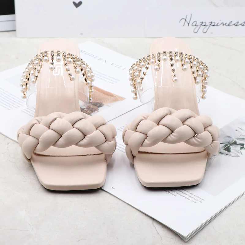Women's Sandals Summer New Products Fashion Chain Pearl PU Handwoven High Heel Women Sandals Party Wedding Shoes 7.5CM